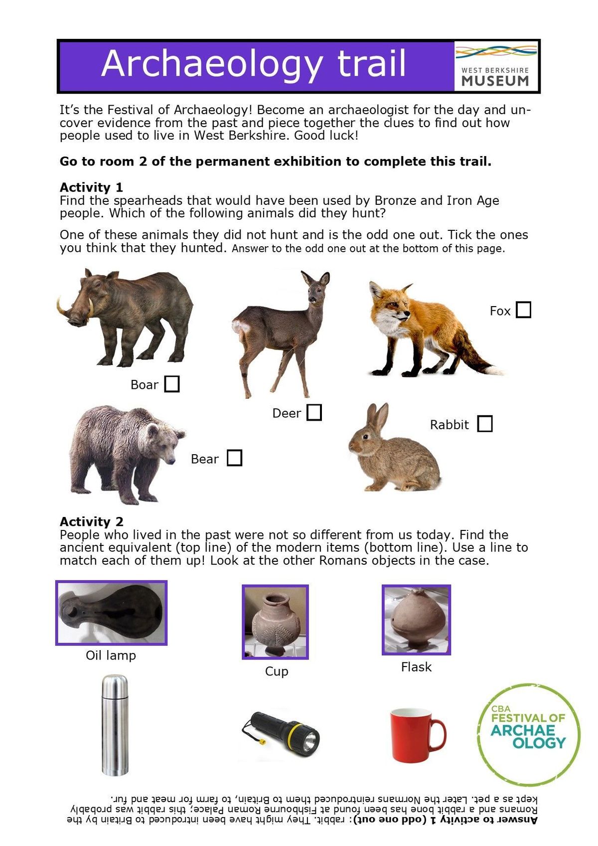 If you visit us at West Berkshire Museum throughout the Festival of Archaeology, please pick up a free family-friendly archaeology trail from the activity trolley in Gallery 1, on the ground floor. With it, you will explore the Museum's permanent exhibition, which tells the story of West Berkshire in chronological order.